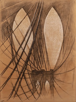 Georgia O’Keeffe’s Study for “Brooklyn Bridge”, 1949, immerses the viewer amid the suspension cables and gothic arches of the celebrated bridge. Created around the time the artist left New York to live in New Mexico, the drawing may serve as her ode to the city.